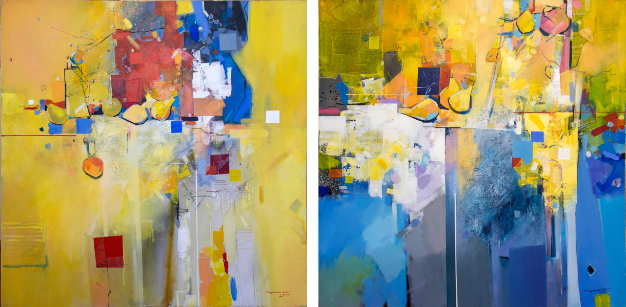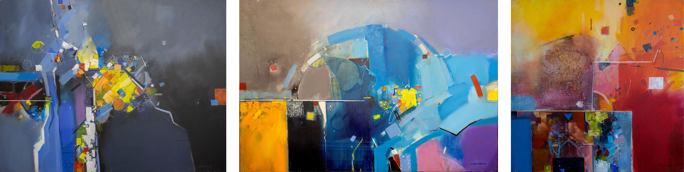 В абстрактната и ярко колоритна акрилна живопис на Валентин Асенов – Хъкъла, няма единен поглед. Има поглед, разпаднат на фрагменти – сякаш светът е видян през начупени стъкла, които увеличават, намаляват, разместват и разкъсват зрителното поле. Платната му не представят свят, а го съграждат от парчета, отслоени от преживяване, отломки от време и памет, елементи, които са били нещо, но вече не са. Това не е разруха, а ново строителство, но по законите на вътрешен ритъм. Всяка линия диша като вентил, всяко цветно петно пулсира, сякаш излива звук. Чертата е едновременно конструкция и колебание, а цветът е и светлина, и сянка на спомен. Това е живопис, която не иска да разкаже, а да се засели в преживяното – да събере преживяното в нова телесност от ритъм, форма и светлина.